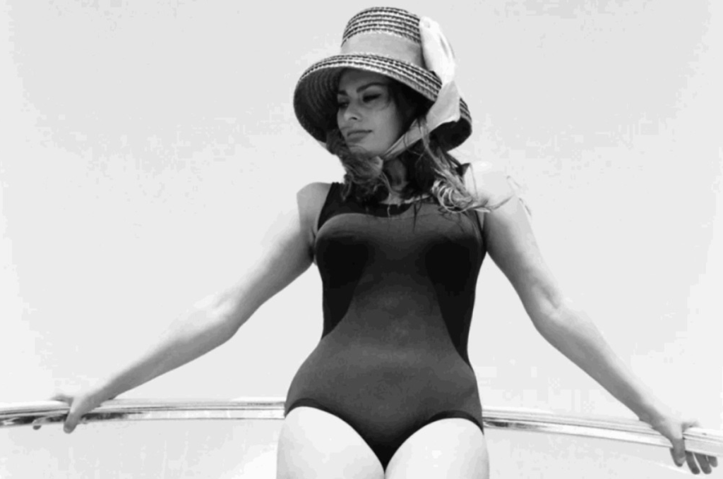 Sophia Loren’s image in a black swimsuit and straw hat on a boat is the epitome of elegance. This still from the film seems like a random photograph, yet it exudes genuine charm.